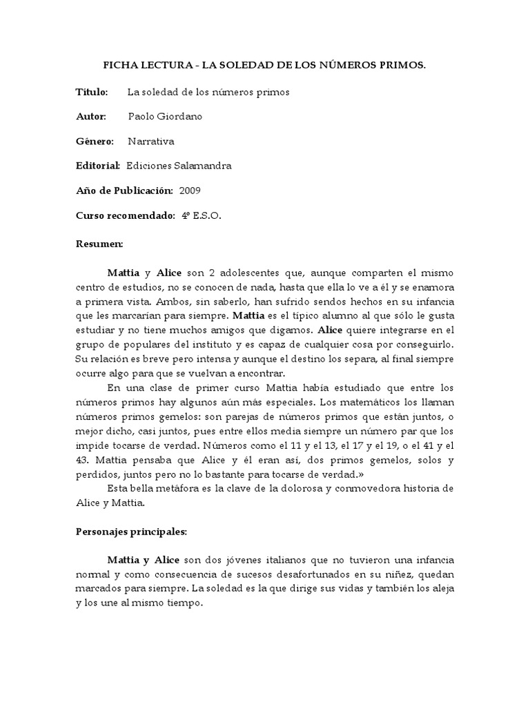 Resumen y sinópsis de la soledad de los números primos de paolo giordano. La soledad de los números primos, la primera novela de este grado en física teórica ha sido galardonado con el premio strega 2008 ?? Grandes temas de la matemática: En la escuela, mattia había estudiado que entre los números primos (los que sólo son divisibles por sí mismos o por la unidad) hay algunos muy especiales. Violeta atienza atienza pereira pereira.